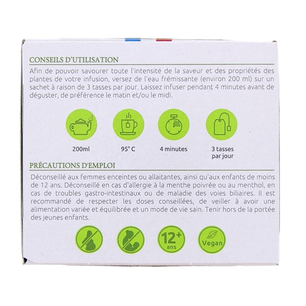 L’infusion bio menthe poivrée d’Herbesan est présentée dans une boîte contenant 20 sachets. Cette formule permet de profiter des bienfaits de la menthe poivrée en la préparant simplement en infusion. Vous pouvez la savourer à la fin de votre repas pour transformer ce moment en un véritable instant de détente.
