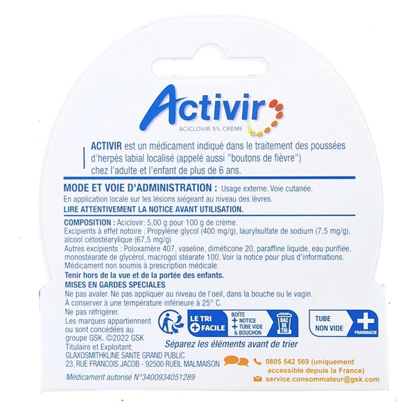 Ce médicament disponible sans ordonnance est destiné à être utilisé sur les conseils de votre pharmacien ; signalez-lui tout antécédent de réaction allergique à un médicament contenant de l'aciclovir ou du valaciclovir. Ne l'utilisez pas pour des lésions herpétiques situées ailleurs que sur les lèvres.
