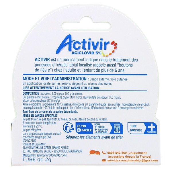 Activir 5% crèmactivir,aciclovir,herpese est disponible en tube de 2 grammes.