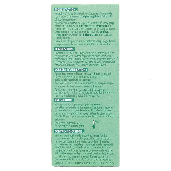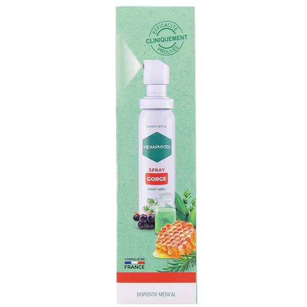 Hexaphyto Spray Mal de gorge intense est formulé à base de miel, sureau noir, thym et romarin pour soulager rapidement et efficacement la douleur et l'irritation. Il convient aux adultes et enfants de plus de 12 ans.