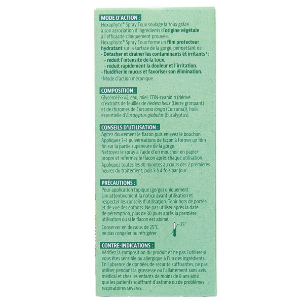 Hexaphyto Spray Toux est formulé à base de miel, de lierre grimpant et de curcuma pour soulager naturellement, rapidement et efficacement la toux et l'irritation. Il convient aux adultes et enfants de plus de 8 ans.