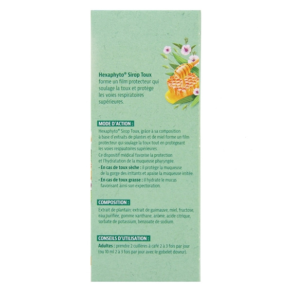 Hexaphyto Sirop Toux est formulé à base de miel, de guimauve et de plantin pour calmer naturellement, rapidement et efficacement la toux. Il convient aux adultes de plus de 18 ans.
