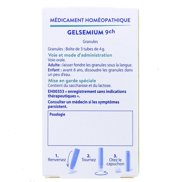 À base de saccharose et de lactose, les granules sont imprégnées de la dilution homéopathique de Gelsemium 9CH.