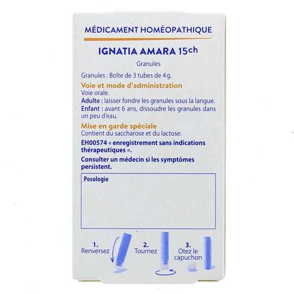 À base de saccharose et de lactose, les granules sont imprégnées de la dilution homéopathique de Ignatia Amara 15CH.