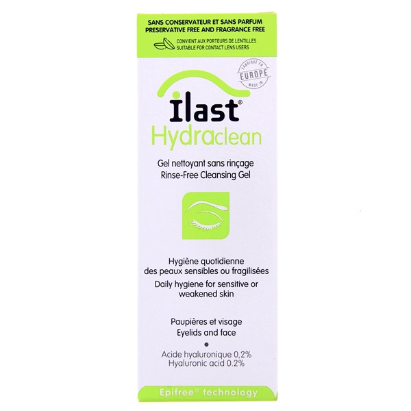 Ilast Hydraclean est un gel nettoyant sans rinçage indiqué pour l'hygiène quotidienne des peaux des paupières et du visage sensibles ou fragilisées.