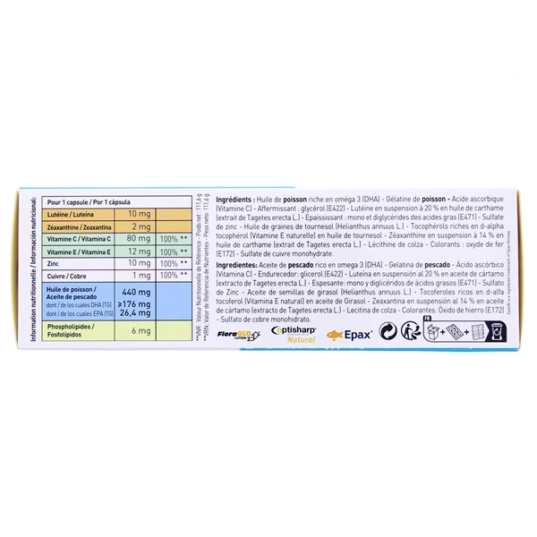 Huile de poisson riche en oméga 3 (DHA) - Gélatine de poisson - Acide ascorbique (Vitamine C) - Affermissant : glycérol (E422) - Lutéine en suspension à 20 % en huile de carthame (extrait de Tagetes erecta L.) - Epaississant : mono et diglycérides des acides gras (E471) - Sulfate de zinc - Huile de graines de tournesol (Helianthus annuus L.) - Tocophérols riches en d-alpha tocophérol (Vitamine E naturelle) en huile de tournesol - Zéaxanthine en suspension à 14 % en huile de carthame (extrait de Tagetes erecta L.) - Lécithine de colza - Colorants : oxyde de fer (E172) - Sulfate de cuivre monohydrate.