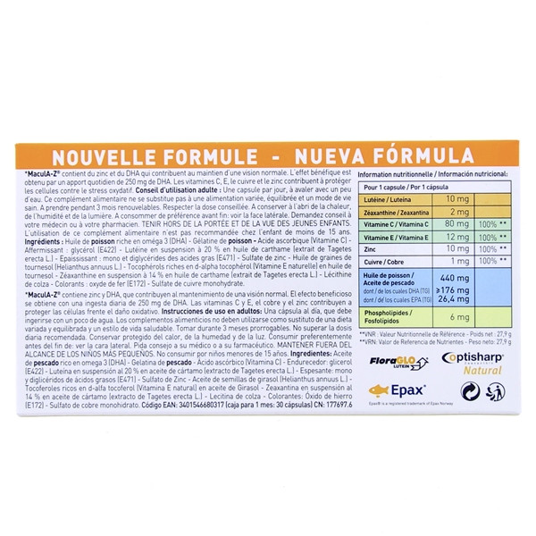 Préparé avec des huiles de poisson riche en oméga-3 (DHA), MaculA-Z apporte à votre corps les acides gras essentiels pour une fonction visuelle optimale.