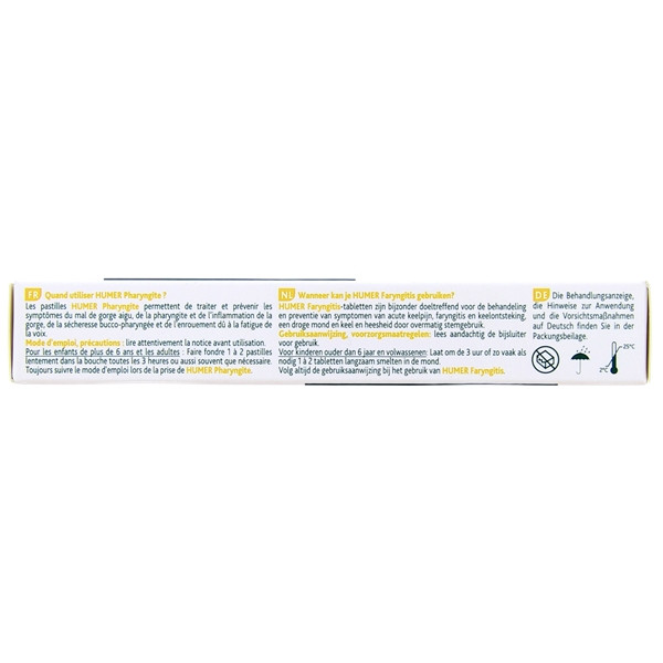 Disponible en boîte de 20 pastilles, Humer Pharyngite constitue une solution naturelle et fiable pour retrouver rapidement votre confort et pour atténuer la douleur au niveau de la gorge.