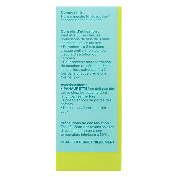 Utilisé dans le cadre de l'hygiène auriculaire, Panaurette permet la prévention, la dissolution et l'extraction des bouchons d'oreilles (bouchon de cérumen). Le spray Panaurette peut être utilisé chez l'adulte, l'enfant et le nourrisson de plus de 3