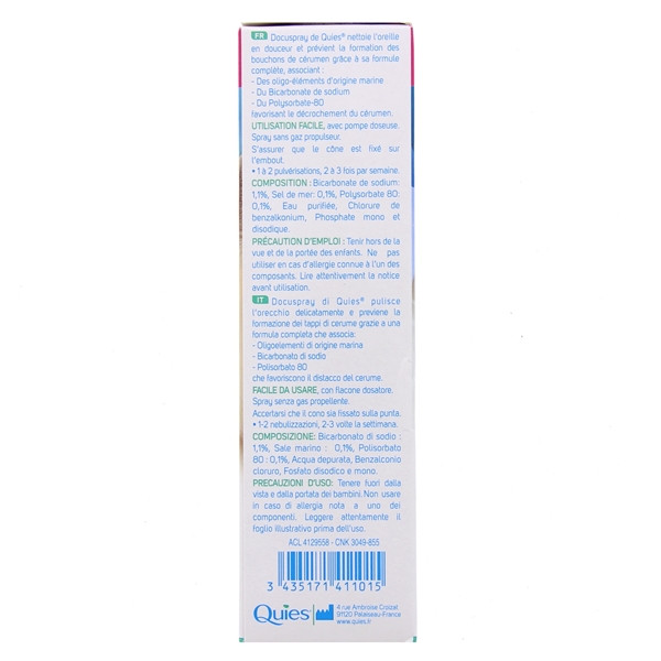 Docuspray de Quiès est un spray auriculaire idéal pour l'hygiène auriculaire. Sans gaz propulseur, il s'utilise pour toute la famille, à partir de 30 mois. Docuspray est recommandé pour l'entretien régulier et non traumatique de l'oreille. Il facilite l'élimination des résidus de cérumen et de peaux mortes.