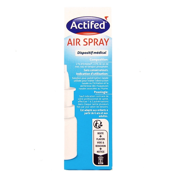 La solution hypertonique Actifed Air Spray est spécialement conçue pour le décongestionnement du nez et des sinus en cas de rhume ou de rhinite, grâce à l'eau salée. L'ectoïne présente dans sa formulation a des effets hydratants grâce à la formation d'un film qui soulage les irritations nasales sans remettre en cause la barrière naturelle de protection de l'organisme. La formule de ce produit ne contient pas de conservateur. Le produit peut être utilisé aussi bien par les adultes que les enfants à partir de 6 ans.