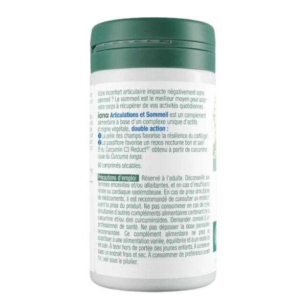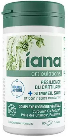 Iana Articulations Résilience du Cartilage et Sommeil Sain est formulé à base d’un complexe exclusif d’ingrédients d’origine végétale exerçant deux actions sur l’organisme. La prêle des champs, un allié précieux des articulations et des os, stimule le renforcement du cartilage. Cette plante contient de la silice naturelle qui soutient les articulations lors d’une arthrose naissante et consolide les tissus osseux en cas d’ostéoporose. Le Curcumin C3 Reduct possède des propriétés anti-inflammatoires qui soulagent les douleurs articulaires. Il renferme aussi de la curcumine, une substance qui limite la perte de cartilage caractéristique de l’arthrite. La passiflore apporte ses vertus tranquillisantes qui apaisent l’agitation, l’anxiété, le stress et aident à lutter contre les troubles du sommeil. Conditionnement : flacon de 60 comprimés sécables.