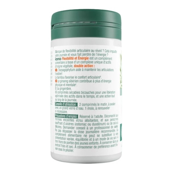 Iana Flexibilité et Énergie Articulations contient un complexe d’actifs végétaux. L’harpagophytum détient des propriétés anti-inflammatoires et analgésiques qui aident à combattre les douleurs dues aux rhumatismes ou aux contractures musculaires, notamment en cas de lombalgie, d’arthrose ou de raideur des articulations. Le bambou soulage les tensions musculaires et permet de se prémunir contre la dégénérescence du cartilage. Cette plante peut être utilisée pour traiter l’arthrose et l’ostéoporose. Elle permet aussi de préserver la santé des os et favorise le confort articulaire. Le ginseng sibérien complète la formule pour stimuler l’énergie physique et mentale. Cet ingrédient est connu pour ses vertus sur la vitalité générale. Il aide à combattre la fatigue, la dépression, l’anxiété et accroît l’endurance physique. Conditionnement : flacon de 60 comprimés bicouches sécables qui libèrent les actifs dans le sang pour des effets durables.