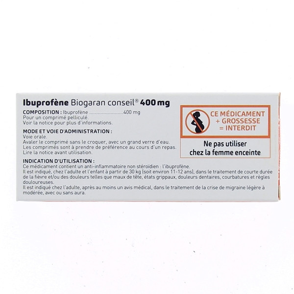 Le dosage à 400 mg est également utilisé dans le traitement de la crise de migraine chez l'adulte, après au moins un avis médical.