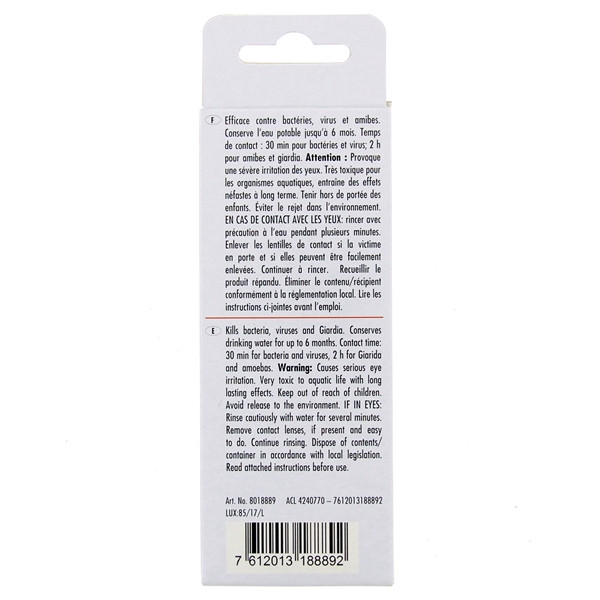 Pour éradiquer des micro-organismes comme giarda, laissez agir le produit pendant 2 heures avant d'utiliser l'eau.