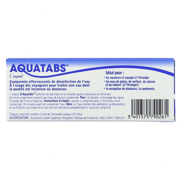 Les comprimés effervescents de désinfection de l'eau Aquatabs sont destinés à l'usage des voyageurs pour traiter une eau dont la qualité est inconnue ou douteuse. Aquatabs prévient les diarrhées et les troubles gastro-intestinaux en éliminant les micro-organismes transmis par l'eau de boisson contaminée.