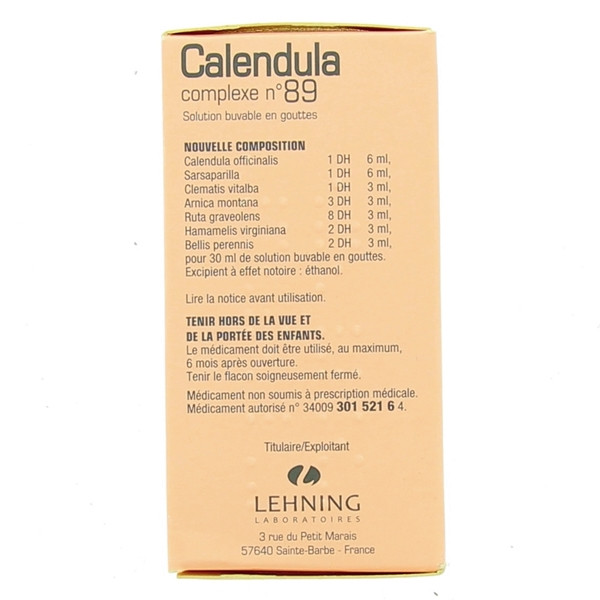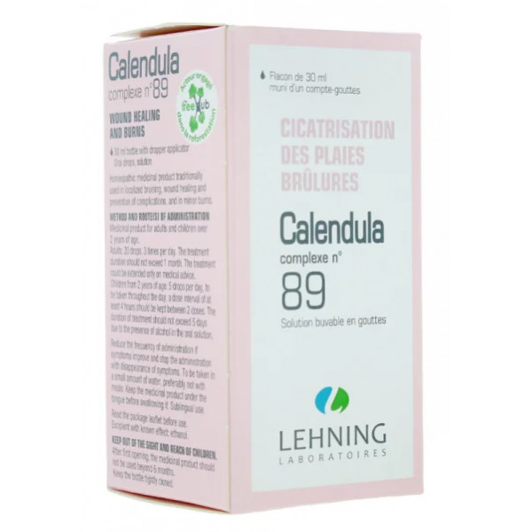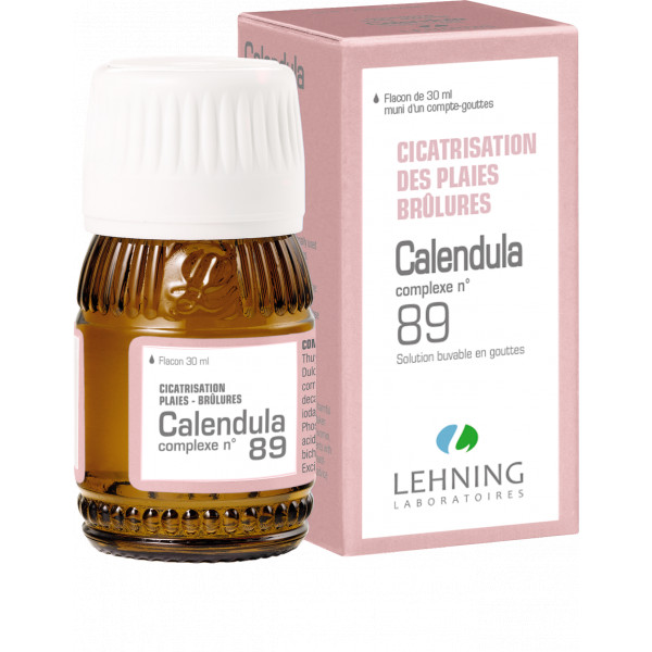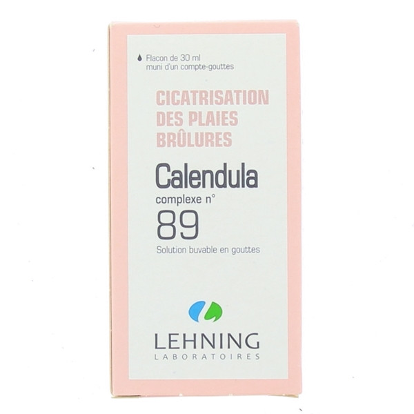 Le médicament homéopathique Calendula complexe n°89 du laboratoire Lehning est une solution buvable traditionnellement utilisée dans les traumatismes, pour la cicatrisation des plaies et la prévention de leurs complications ainsi que dans les brûlures superficielles et peu étendues.