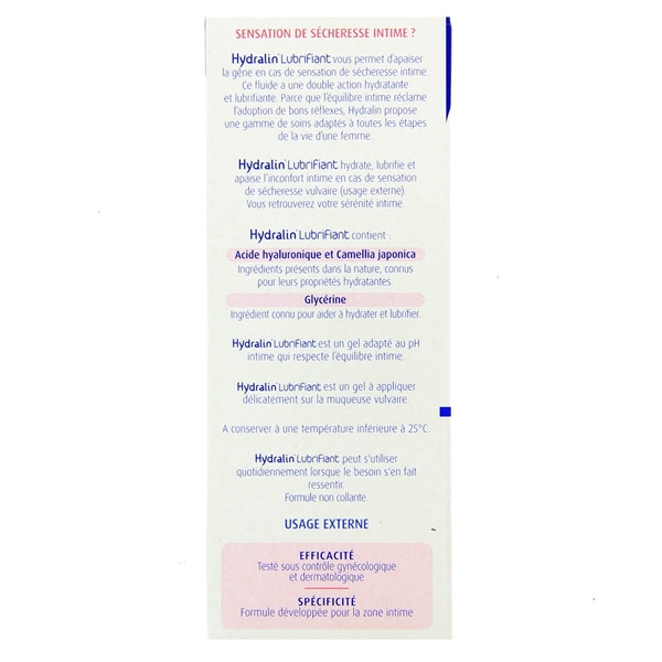 Grâce à une formule enrichie en acide hyaluronique, en glycérine et extraits de Camélia Japonica, le gel intime HYDRALIN® lubrifiant hydrate et lubrifie efficacement les muqueuses vaginales avant et durant les rapports sexuels.
