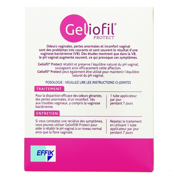 Les Laboratoires Effik développent le gel intravaginal Geliofil. Disponible en boîte de 7 unidoses de 5 ml. Réalisé à base d'acide lactique et de glycogène, ce gel naturel restaure la flore vaginale, mais également le pH physiologique vaginal. Grâce à l'action de ses deux composants et de son pH physiologique, ce gel vaginal avec canule, lubrifiant hydratant et intime soulage rapidement, tout en rééquilibrant la flore vaginale. Le Glycogène constitue la source alimentaire des bacilles de Döderlein qui ont un effet protecteur de la flore vaginale et l'acide lactique abaisse le pH vaginal.