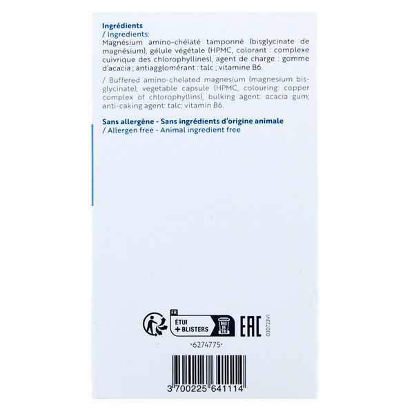 Magnésium amino-chélaté tamponné - chlorhydrate de pyridoxine (vitamine B6) - gélule végétale (HPMC) - antiagglomérant : talc.
