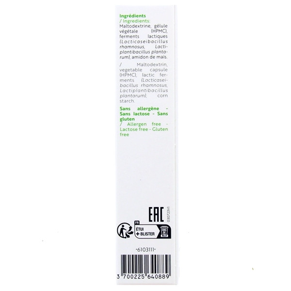 Maltodextrine, gélule végétale (HPMC), ferments lactiques (Lacticaseibacillus rhamnosus, Lacti-plantibacillus plantarum), amidon de maïs.