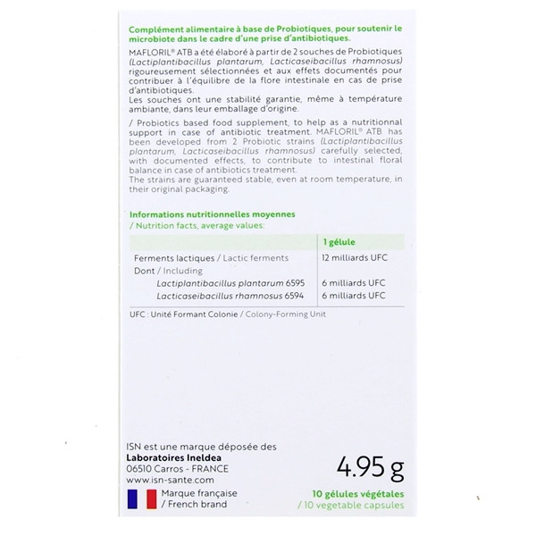 ISN Mafloril ATB est formulé à base d’un mélange optimisé de 2 souches de ferments probiotiques nécessaire lors d’une prise d’antibiotiques. Ce complexe qui est résistant aux sucs gastriques et aux sels biliaires se compose notamment de Lactobacillus plantarum 6595 et de Lactobacillus rhamnosus 6594. La technologie de fabrication de ce produit lui permet d’apporter 12 milliards de ferments afin d’assurer une stabilité optimale de la flore intestinale. Il est conditionné dans des gélules végétales gastro-résistantes pour effectuer une libération progressive dans l’intestin.