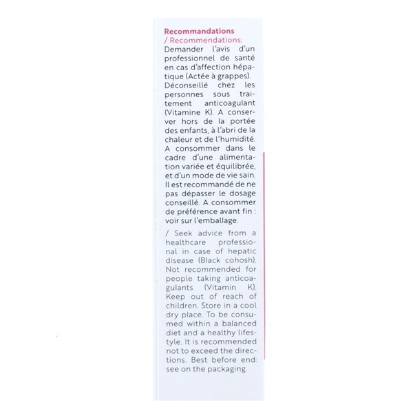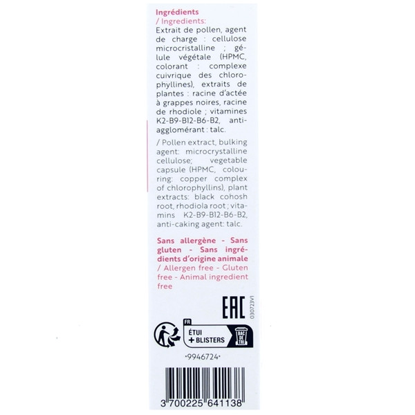 Extrait de pollen, agent de charge : cellulose microcristalline ; gélule végétale (HPMC, colorants : complexe cuivrique des chlorophyllines), extraits de plantes : racine d’actée à grappes noires, racine de rhodiole ; vitamines K2-B9-B12-B6-B2, anti-agglomérant : talc.