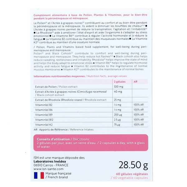 Menogyne de la marque ISN des laboratoires Ineldea est un complément alimentaire à base de Pollen, Plantes et Vitamines pour le bien-être pendant la périménopause et la ménopause.