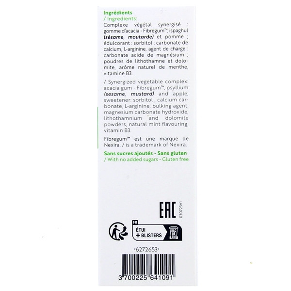 Complexe végétal synergisé : gomme d’acacia - Fibregum™, ispaghul (sésame, moutarde) et pomme ; édulcorant : sorbitol ; carbonate de calcium, L-arginine, agent de charge : carbonate acide de magnésium ; poudres de lithothamne et dolomite, arôme naturel de menthe, vitamine B3.