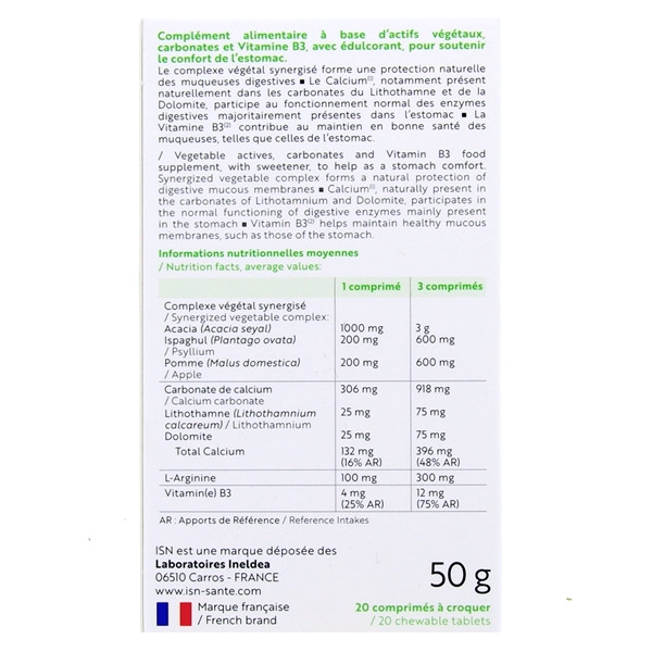 ISN Stomacalm Reflux renferme des extraits végétaux et des carbonates pour atténuer les brûlures d’estomac. Les extraits de pomme, d’ispaghul et d’acacia forment une barrière protectrice sur la muqueuse gastrique afin de réduire le contact direct du contenu acide avec l’œsophage. Le calcium, le lithothamne et la dolomite dans sa composition neutralisent l’excès d’acidité et limitent les risques de remontées acides. Le lithothamne maintient l’équilibre acido-basique, tandis que la dolomite stabilise le pH gastrique. L’arôme mentholé de ce supplément procure une agréable sensation de fraîcheur lors de la prise.