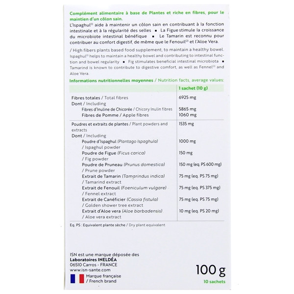 ISN Detox Colon est destiné à une cure de 10 jours. Il est doté d’une formule sans gluten, ni conservateurs, ni colorants, ni arômes artificiels, ni ingrédients d’origine animale.