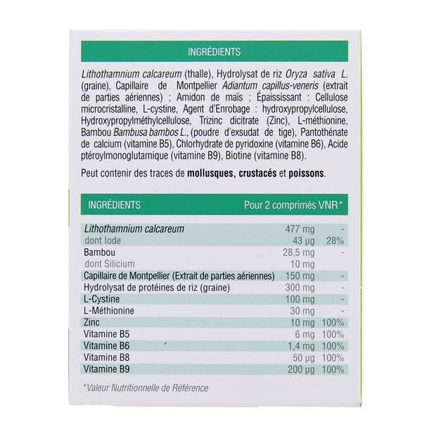 Lithothamnium calcareum, Hydrolysat de riz, Capillaire de Montpellier Adiantum capillus-veneris, Amidon de maïs, Trizinc dicitrate, Bambou/Bambú Bambusa bambos L., Cellulose microcristalline, Pantothénate de calcium, Chlorhydrate de pyridoxine, Acide ptéroylmonoglutamique, Biotine.