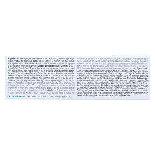 Les capsules ELTEANS AD ont été spécialement développées pour répondre aux besoins des peaux sensibles et exigeantes. Elles offrent une combinaison unique d'oméga 3-6-9 provenant de l'huile de poisson, d'huiles de bourrache et de chia, de zinc, de vitamine D et de mélisse pour nourrir et apaiser la peau. Les résultats sont visibles après seulement 15 jours d’utilisation.