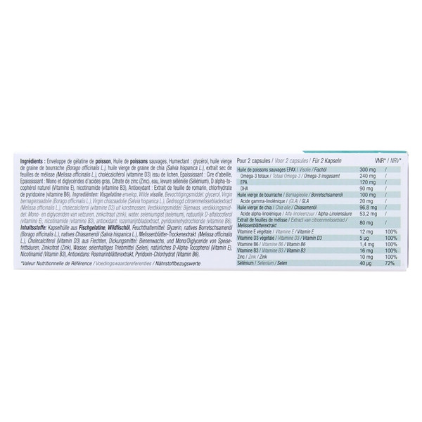 Les capsules ELTEANS AD contiennent de la gélatine de poisson, des huiles de poissons sauvages, de la bourrache, de la chia, de la mélisse, du lichen pour la vitamine D3, du zinc, de la vitamine E, B3 et B6.