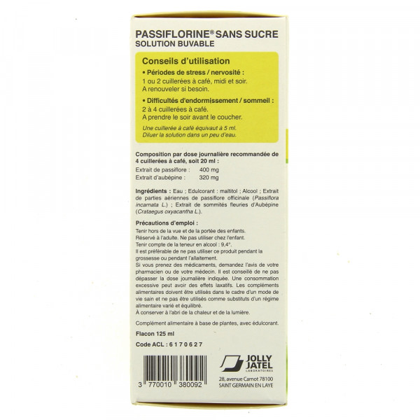 La solution buvable sans sucre Passiflorine est disponible en flacon de 125ml.
