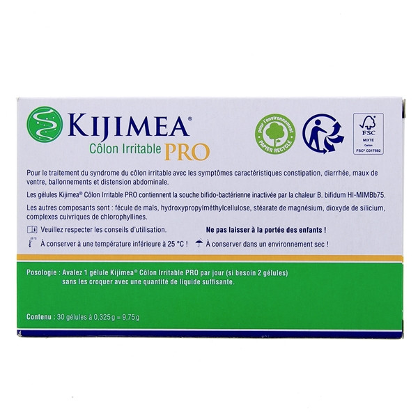 Kijimea Colon Irritable Pro est conditionné dans une boîte de 30 gélules. Ce format est prévu pour un programme d’un mois, notamment en phase de découverte ou de traitement d’entretien.