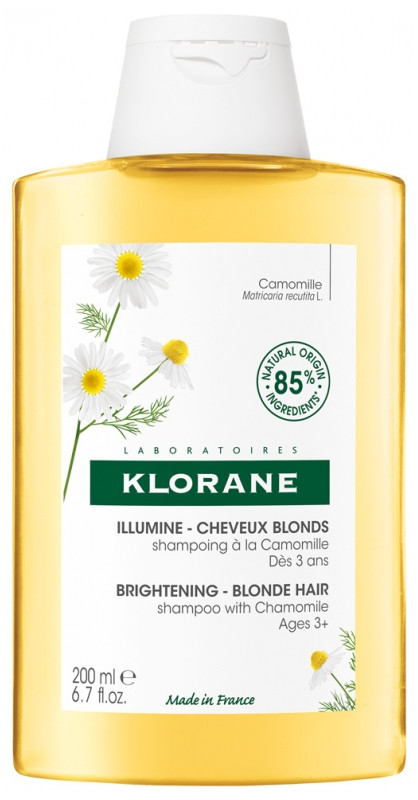 Le Shampoing Camomille Cheveux Blond des laboratoires Klorane nettoie en douceur les cheveux blonds tout en illuminant les reflets dorés naturels, colorés ou méchés de toute la famille dès 3 ans.