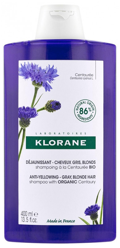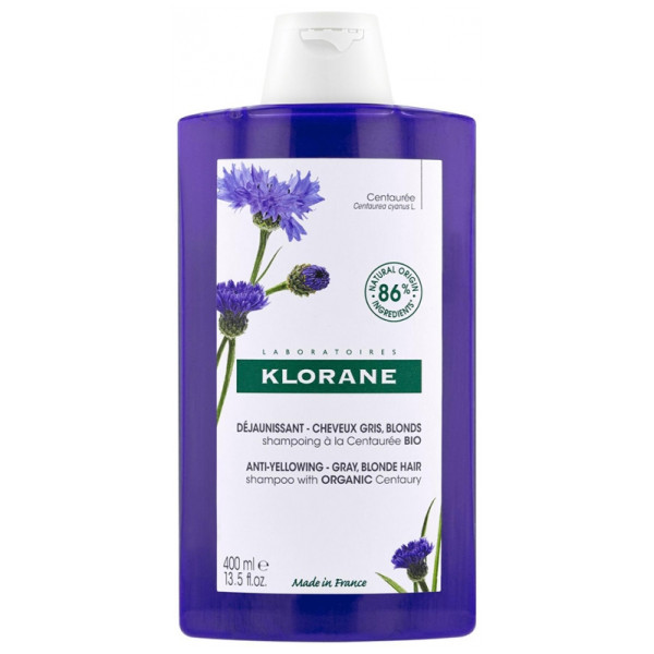 Shampoing Déjaunissant Centaurée Bio 400ml des laboratoires Klorane est un soin capillaire lavant de haute tolérance conçu pour nettoyer en douceur et neutraliser les reflets jaunes qui ternissent l’apparence des cheveux blancs, gris ou blond platine. Ce shampoing permet d’estomper peu à peu ces reflets dès la première utilisation.