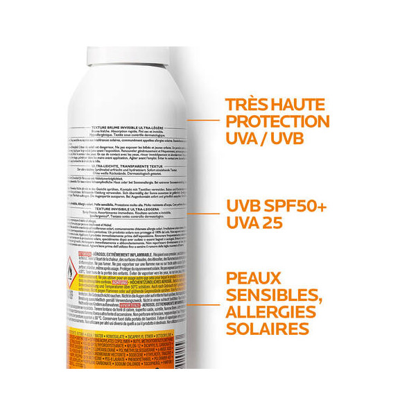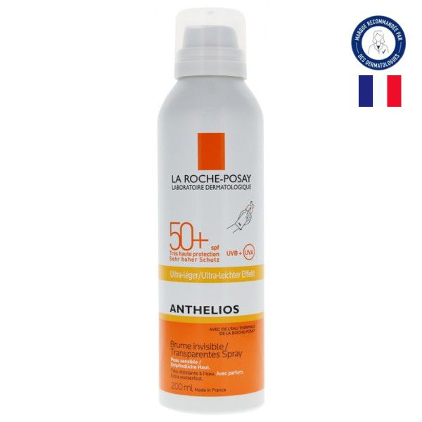 Anthelios Brume Invisible Corps SPF50+ de La Roche-Posay haute protection est une brume qui s'applique et se réapplique en un seul geste grâce à sa diffusion continue. L'absorption est immédiate, la brume est invisible grâce à sa texture fine et légère. Convient aux peaux sensibles.