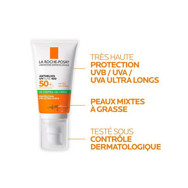 Gel-crème Oil Control Anthélios UVMUNE 400 avec parfum de La Roche-Posay permet de protéger efficacement les peaux mixtes à grasses du soleil pour la prévention des taches pigmentaires dues au soleil (grossesses, photosensibilisations, …) et des dommages cellulaires liés aux UV.