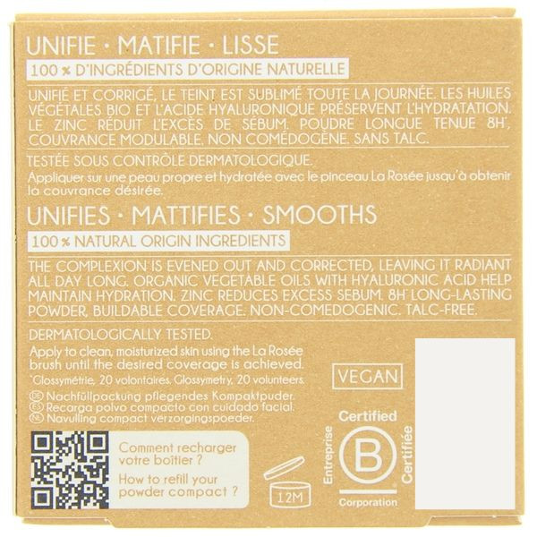 Conçue pour se glisser dans le boîtier vide La Rosée, cette recharge s’insère facilement à l’intérieur et se révèle pratique pour des retouches express grâce à son miroir détachable. En séparant la poudre de son boîtier, la marque La Rosée réduit les déchets et encourage un usage durable. Cela permet de se fixer une routine maquillage plus responsable.