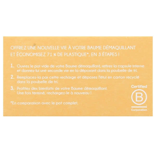 Procédez à la recharge de votre pot vide en y versant le contenu de la recharge. Prélevez ensuite le baume directement avec les doigts. Appliquez-le sur votre peau sèche pour enlever tout type de maquillage. Ajoutez de l’eau pour parfaire le nettoyage. Pour finir, rincez abondamment votre visage à l’eau claire.