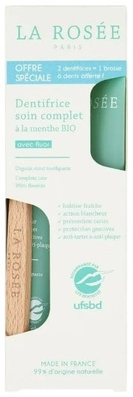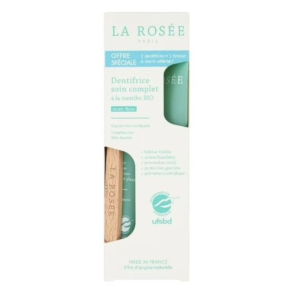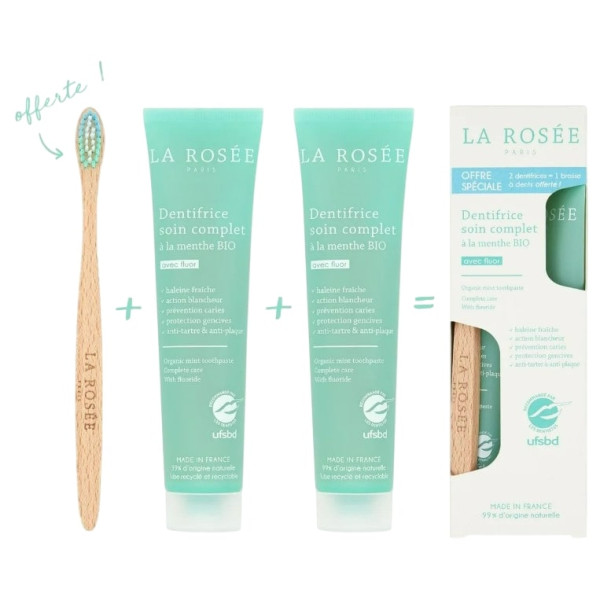 Ce pack dentaire La Rosée contient 2 tubes de dentifrice soin complet menthe bio, enrichi en fluor, ainsi qu'une brosse à dents offerte. Il assure une excellente hygiène bucco-dentaire en nettoyant et protégeant les dents, tout en garantissant une haleine fraîche.