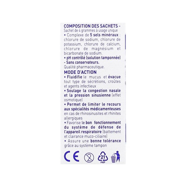 Recommandés pour les adultes et les enfants dès l’âge de 4 ans, ces sachets apportent un soulagement durable en cas de rhinites, de rhinosinusites aiguës ou chroniques, ou de rhinites allergiques. Ils sont également un soutien précieux pour les soins endonasaux post-opératoires, ou encore pour les maladies respiratoires chroniques comme l’asthme et la mucoviscidose.
