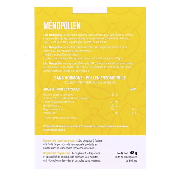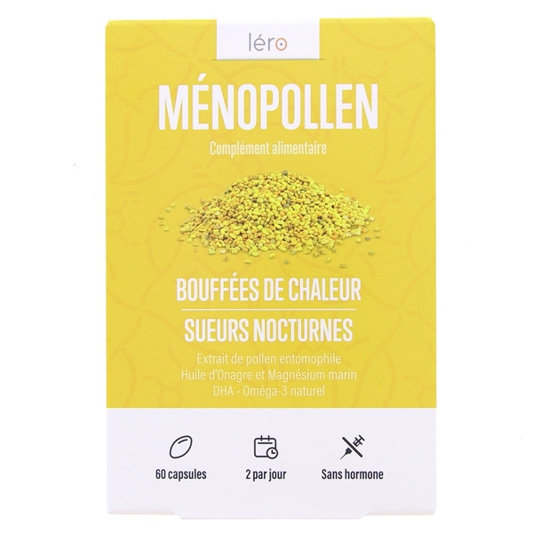 Léro propose Ménopollen une solution naturelle "sans hormone" pour agir sur les signes handicapants de la ménopause. Léro Ménopollen préserve votre bien être grâce à l'association pollen - oméga 3 - Magnésium et huile d'onagre.