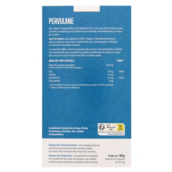 Léro Pervulane soutient les fonctions visuelles sans recourir à des ingrédients chimiques. En effet, parmi ces composants, on retrouve du DHA, un acide gras oméga 3 d’origine marine. Cet ingrédient a été obtenu à partir de l’huile de poissons sauvages. Il fait partie des éléments indispensables pour maintenir la structure et la fonction des membranes cellulaires de la rétine.