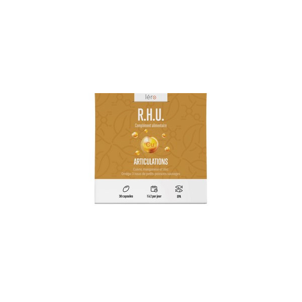 Le complément RHU Articulations du laboratoire Léro est un complément alimentaire formulé à base de Cuivre, Manganèse, Zinc et Oméga-3 issus de petits poissons sauvages pour contribuer au maintien du confort articulaire.