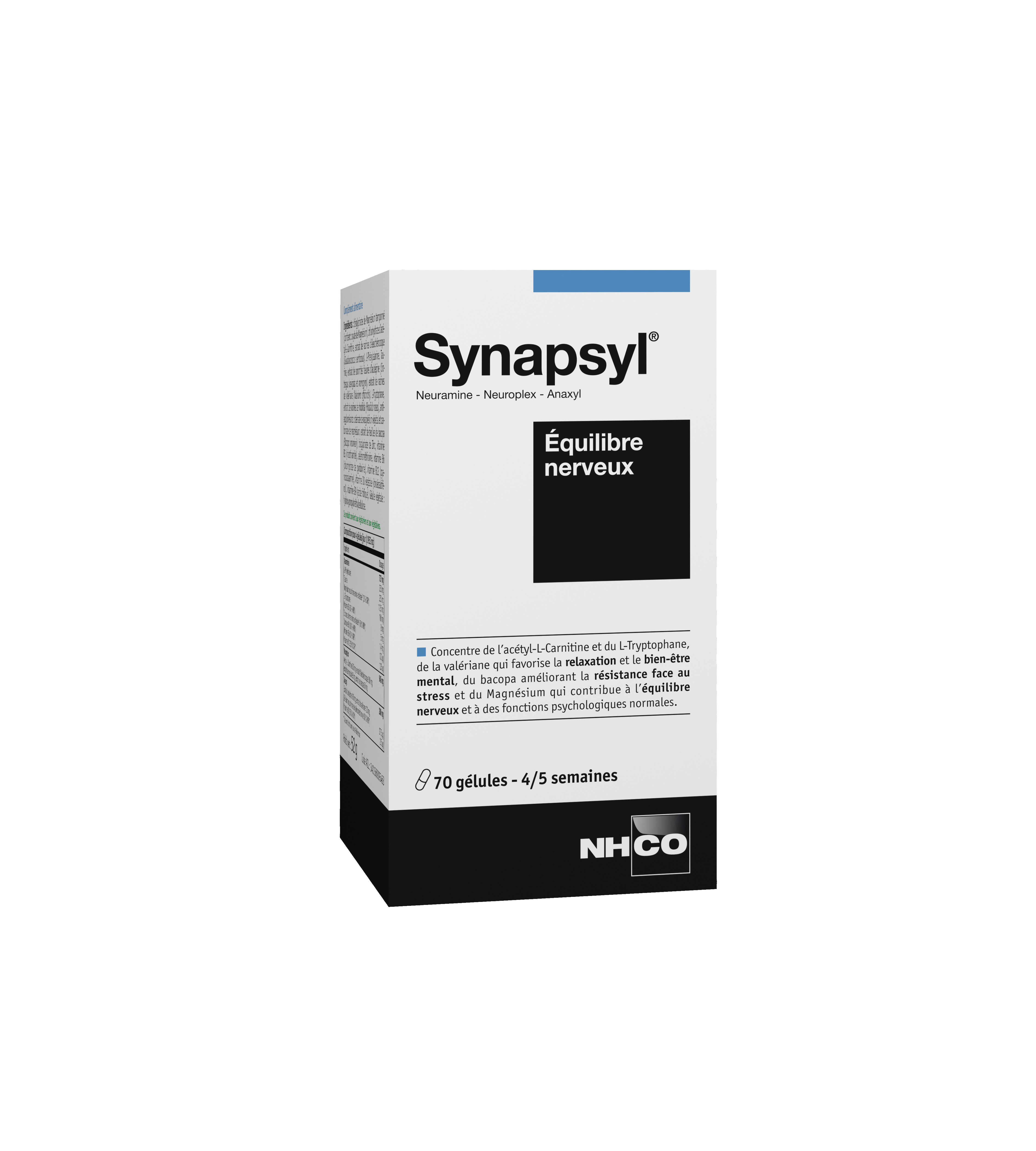 Synapsyl concentre de l’acétyl-L-Carnitine et du L-Tryptophane, de la valériane qui favorise la relaxation et le bien-être mental, du bacopa améliorant la résistance face au stress et du Magnésium qui contribue à l’équilibre nerveux et à des fonctions psychologiques normales.
