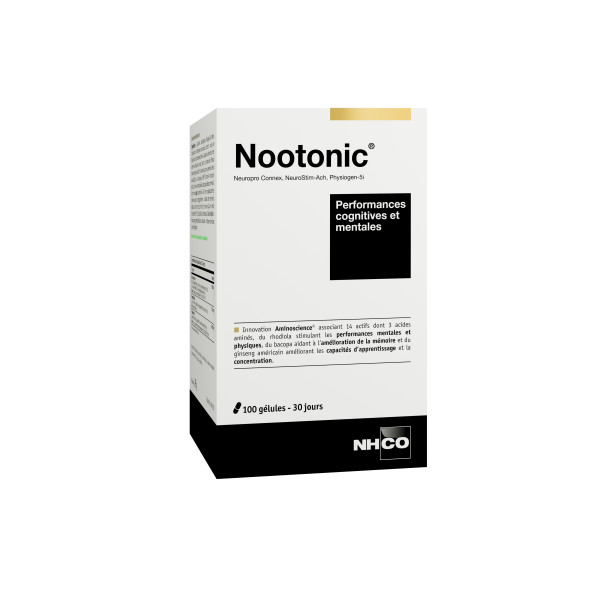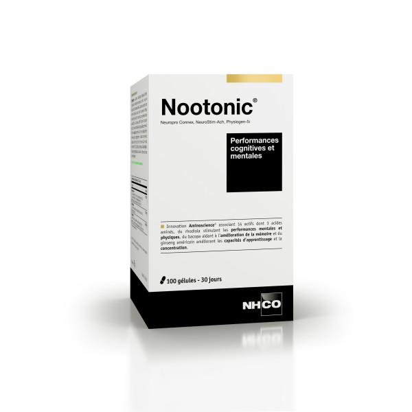 Le terme nootrope désigne toute substance qui améliore les fonctions cognitives et intellectuelles. Certaines substances naturellement présentes dans l’alimentation ou les végétaux ont un effet nootrope scientifiquement prouvé. Ces actifs stimulent généralement la motivation et les performances et réduisent l’impact de la fatigue ou du stress sur le fonctionnement cérébral. Ils peuvent être utilisés pour faire face à des situations exigeantes, sur le plan mental comme physique, pour aider l’organisme à maintenir ses capacités. Les Laboratoires NHCO Nutrition®, spécialistes de l’Aminoscience®, ont mis au point une formule unique et innovante, regroupant 3 complexes d’ingrédients aux actions ciblées.