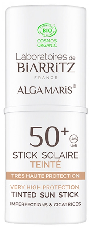 Alga Maris Stick Solaire Teinté SPF50+ Bio des Laboratoires de Biarritz protège efficacement les imperfections, les taches et les cicatrices vulnérables face aux UV. De plus, grâce à sa formule teintée et sa texture couvrante, ce stick les camoufle parfaitement.